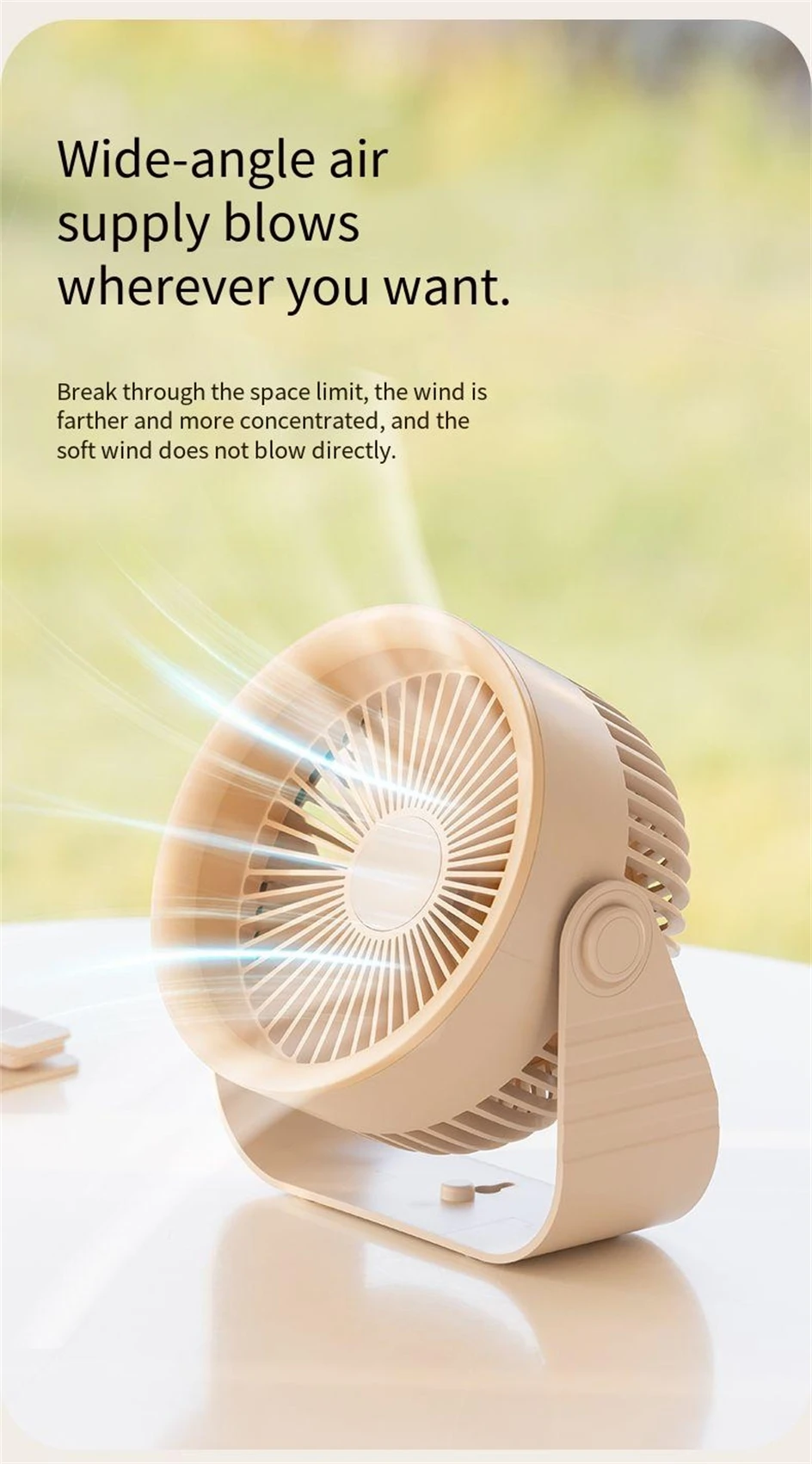 Stay cool wherever you are with the Mini Desktop Folding Fan. Designed to provide efficient airflow in compact areas (10-15㎡), this fan offers both desktop and wall-mounted use. It features a silent yet powerful brushless motor and four fan speeds (natural, sleep, prevailing wind) to suit your needs. With a 3600mAh rechargeable battery, you get up to 7 hours of use on a single charge. Ideal for bedrooms, desks, or small workspaces, this fan is portable, lightweight, and easy to use.