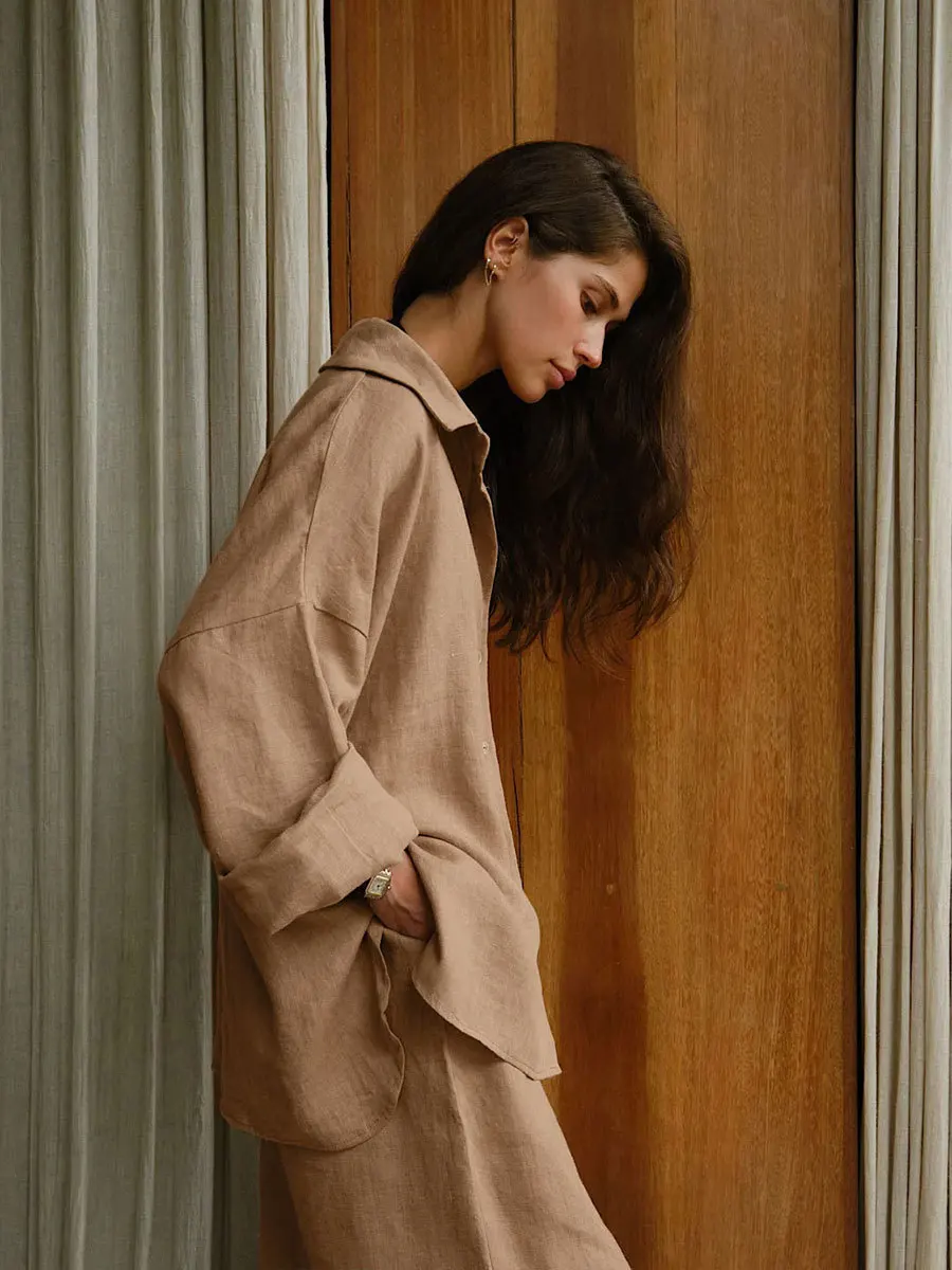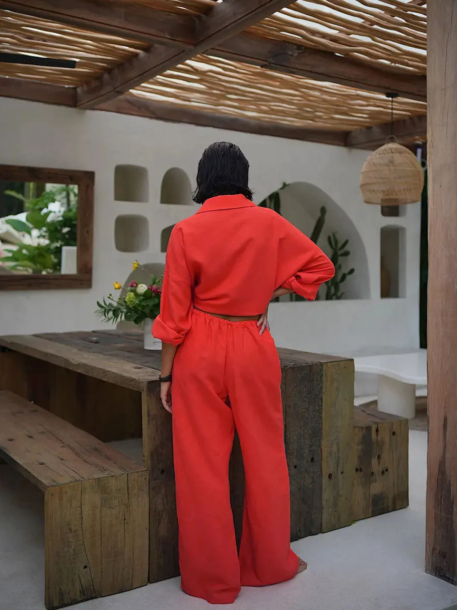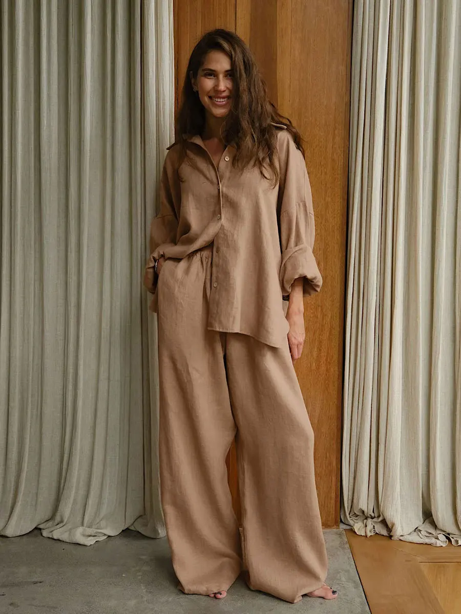 - Two-piece outfit includes a turn-down collar shirt and relaxed wide-leg pants