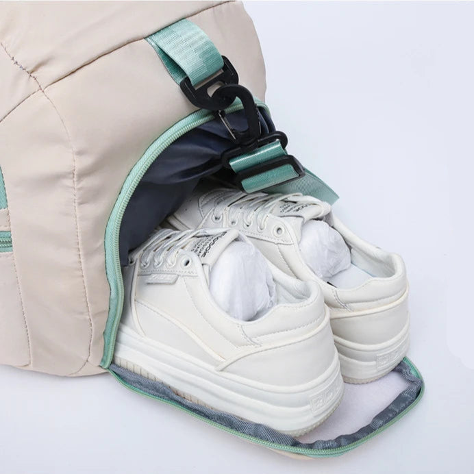 Upgrade your travel and gym routine with this Women’s Large Oxford Travel Tote, combining style, capacity, and durability. Crafted from high-quality waterproof Oxford fabric, it keeps your items safe from moisture while offering a lightweight feel. The spacious 57×26×30 cm interior easily fits clothes, shoes, toiletries, and even a laptop, making it perfect for weekend getaways, fitness sessions, or as a stylish carry-on bag. With its beige body and mint green detailing, this bag blends fashion with functionality, making it a must-have for women on the go.